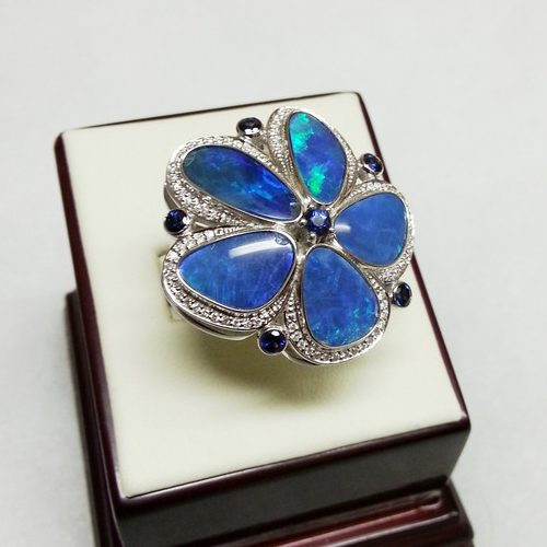 Кольцо с опалами «дуплет», бриллиантами и сапфирами. Ручная работа -