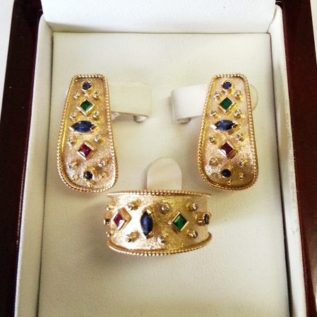 Комплект «Византия» из золота 750 пробы с натуральными рубинами, сапфирами, изумрудами и бриллиантами. Ручная работа. -
