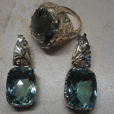Комплект (кольцо и серьги) из золота с празеолитом. Ручная работа. -