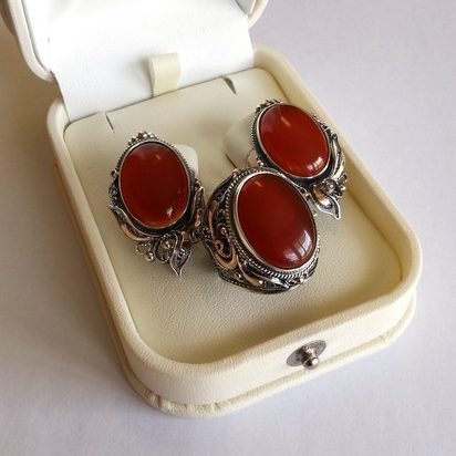 Комплект (серьги и кольцо) из серебра с золотыми элементами. Вставка — сердолик. -