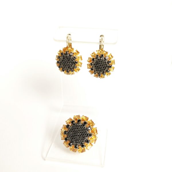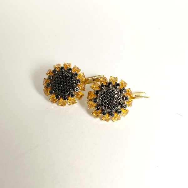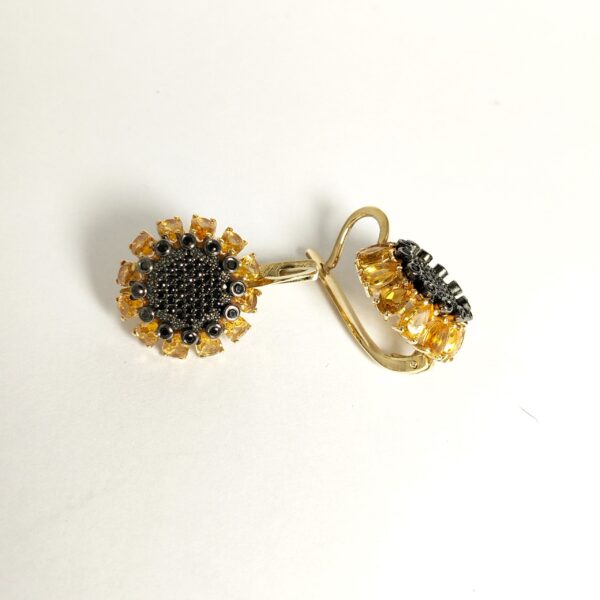 Оригинальные серьги из золота «Подсолнух» арт з280125-10 изготовлены из золота 585 пробы желтого цвета и украшены натуральными цитринами и черными фианитами.
